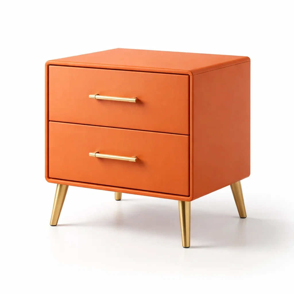 Comodino in pelle pu arancione con due cassetti e gambe in metallo dorato